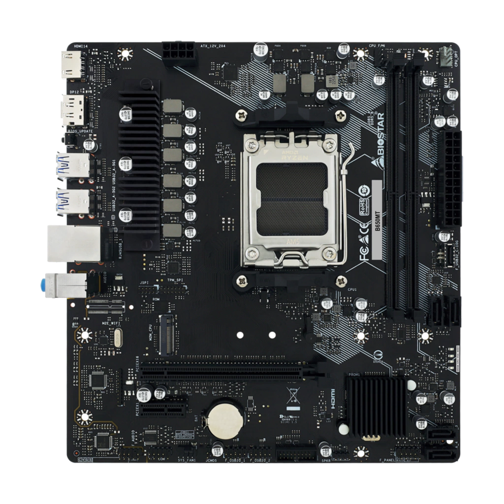 La BIOSTAR B650MT es una potente placa madre AM5 equipada con el moderno chipset AMD B650, compatible con los procesadores Ryzen 5, Ryzen 7 y Ryzen 9 de la serie 7000 (arquitectura Zen 4). Con soporte para memoria DDR5 de alta velocidad, ranura M.2 PCIe Gen4, y conectividad completa, es ideal para PCs modernas de alto rendimiento, ya sea para gaming, diseño o uso profesional.
